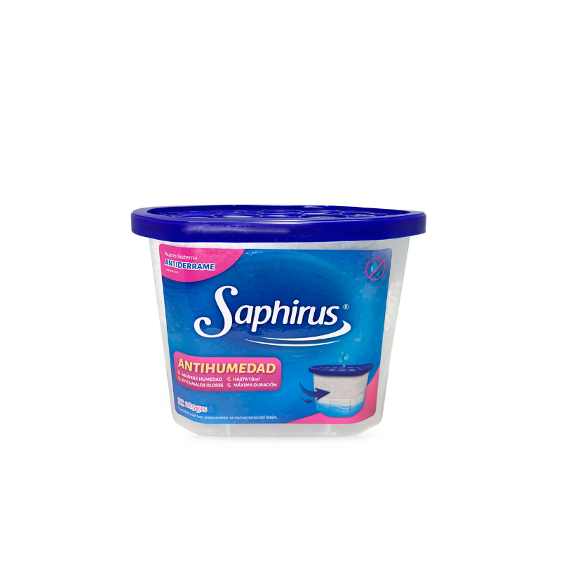 El Antihumedad Saphirus absorbe el exceso de humedad del ambiente depositándola en forma de líquido en la parte inferior del recipiente. Indicado para reducir problemas derivados de la humedad tales como hongos, moho y malos olores. Puede ser utilizado en placares, habitaciones, vestidores y pequeños espacios. Es indicado tambien para evitar malos olores en prendas de vestir.